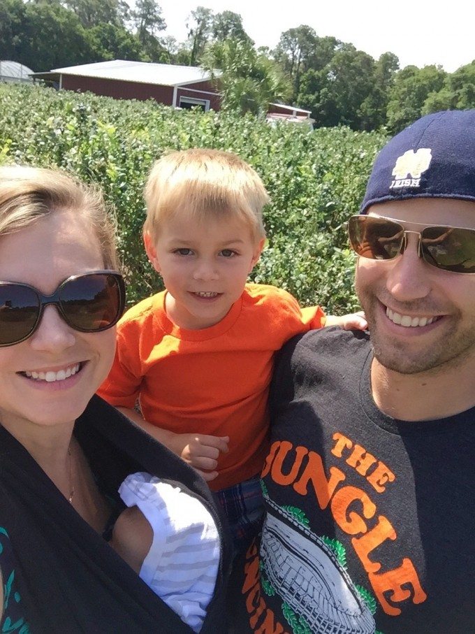 Even though last year Jonathan and I managed to separately tromp on two different fire ant hills during our annual trip to the blueberry farm, it remains one of our favorite family outings from each year that we’ve lived here. It was actually our first outing as a family of four- notice our 3 week old Michael snug on my chest!