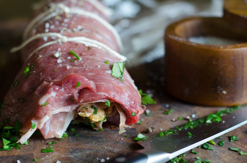 - Starting at the short side, roll up the steak and tie with cooking twine. Season with salt and pepper.