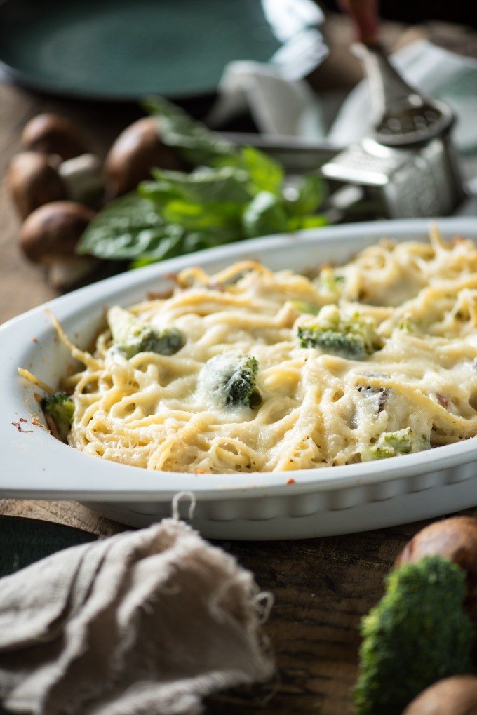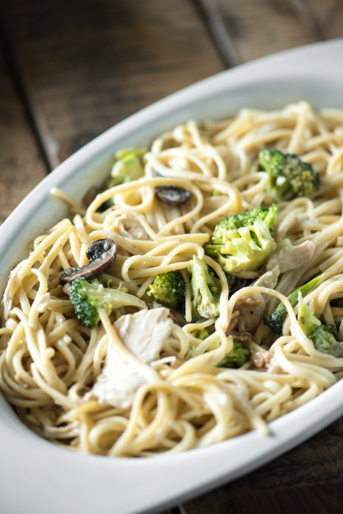 - Add in the chicken, broccoli, and cooked spaghetti, reserved mushrooms and bacon. Toss until combined.