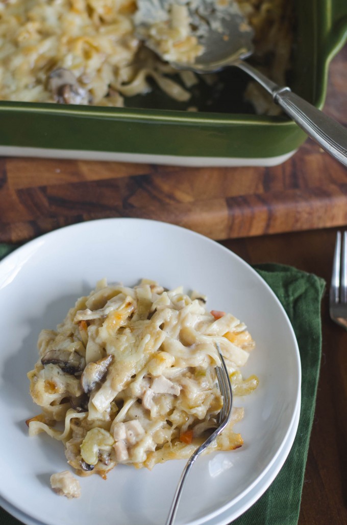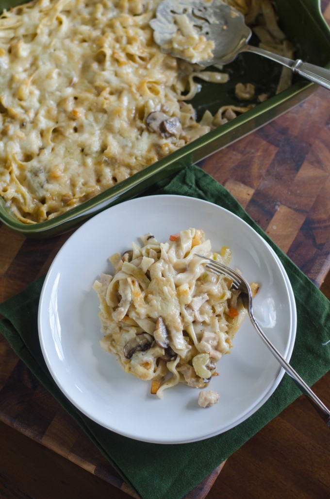 I happened to pass the ready-made dinner case in the grocery store, and I spied chicken tetrazzini. I thought to myself “Boy, I haven’t had that in years. Maybe not even since college.” I distinctly remember eating this dish everytime it was offered in the dining hall- cheesy, creamy noodles, studded with chicken and mushrooms. There’s nothing to complain about there.