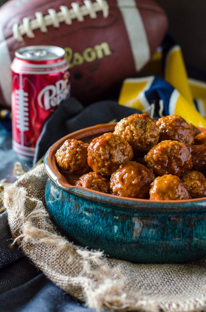 What is it about football and tailgating food that is just so… scrumptious? Is it that it’s always warm, and reminiscent of fall? I can’t put my finger on it, but I do know that I’ve never met a tailgating food I didn’t like- especially those little meatballs in that sweet sauce. I did a version of those in the slow cooker using Dr Pepper® – the perfect complement to football! The great thing about using Dr Pepper is that it really cuts down on my ingredient list. It’s already comprised of so many unique flavors, just the right amount of sweet, that you just have to combine it with a couple other basic pantry ingredients to come up with a great slow cooker sauce for frozen meatballs.