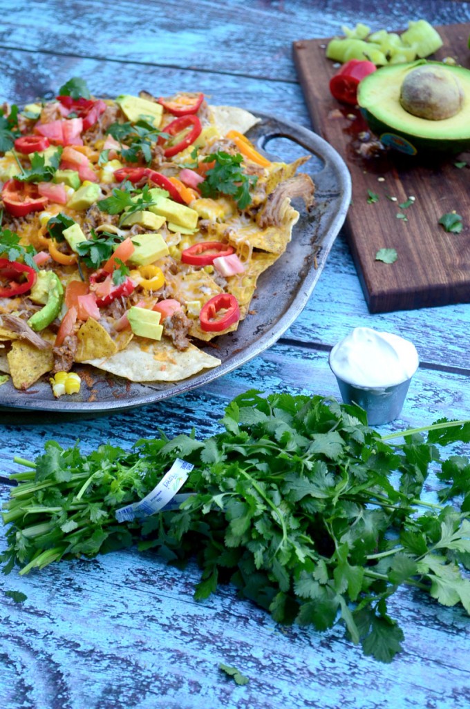 - Spread out the chips evenly across the platter. Top with half the carnitas, chorizo, corn and sweet peppers, then top with 3/4 cup of cheese (or more. Repeat with the second layer, adding the other peppers, tomato, avocado and cilantro. Top with the remaining cheese.