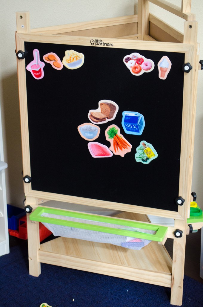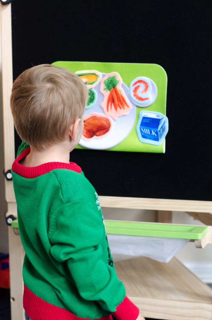 I got Jonathan a set of felt cut outs to play with on the felt side of the board. We use it to do a sort of “What’s for dinner today?” kind of thing. It has been great for teaching him different foods that he didn’t already know, but it does constantly remind him of the existence of one of his favorite foods- doughnuts.