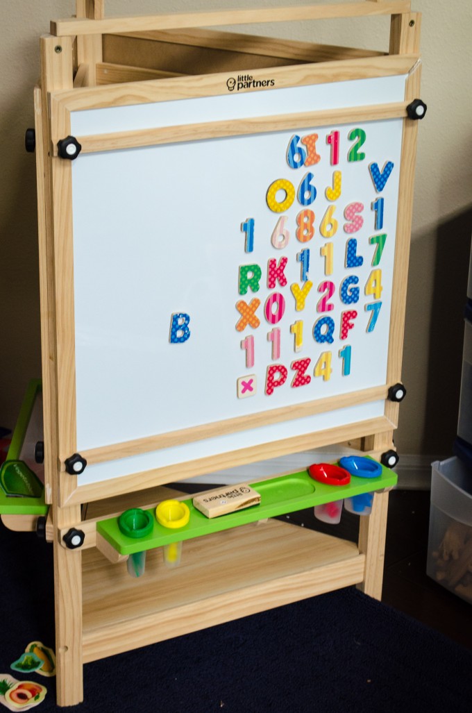 We also have the Tri-Sided Easel, which I know will be great when Michael is a little older and “sharing” becomes a more tenuous subject (not that it’s going so well now). This easel is large and sturdy, with three sides (duh)- chalkboard, white board and felt. The whiteboard side also has a place to put a roll of paper up for painting, and two bars to hold the paper in place while busy little artists get to work. Each side of the easel has its own special storage area- the white board has a place for an eraser, as well as four non-still paint cups. The felt side has a narrow, but long, mesh basket to hold your felt pieces and the chalkboard side has a tray to hold all the chalk.