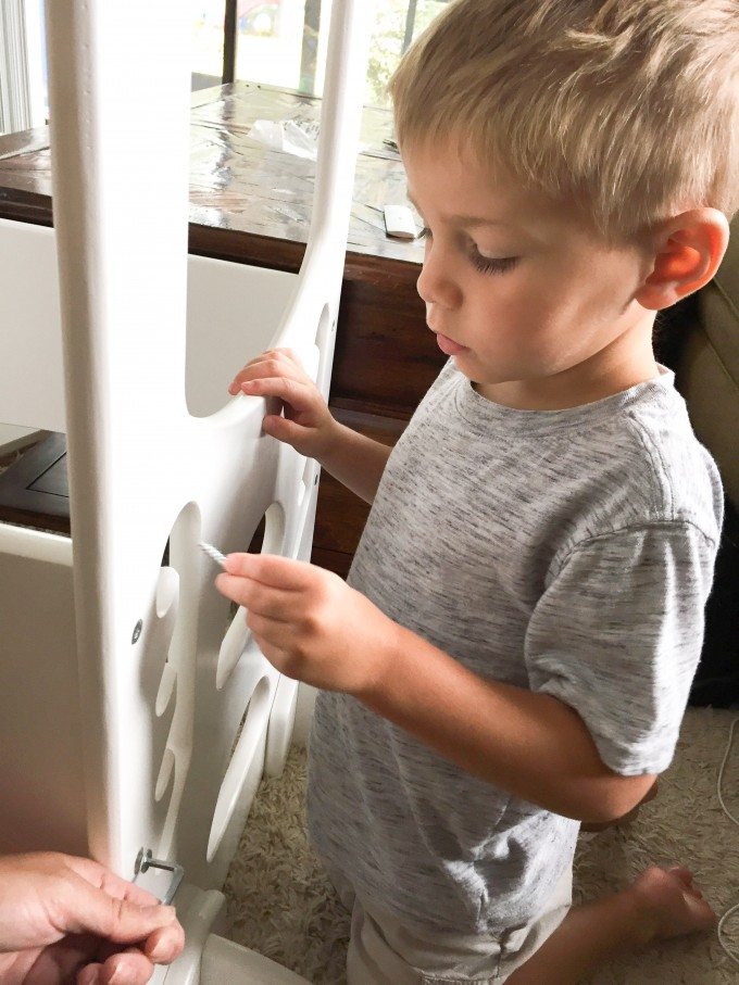 The biggest reason to own one of these is safety. When Jonathan was interested in helping in the kitchen, I was not at the point where I trusted him to stand on something high and not fall backwards or lose his balance. I honestly think that Michael could stand in this thing safely. The upper rails prevent kids from falling out the sides or back, especially when reaching for something.