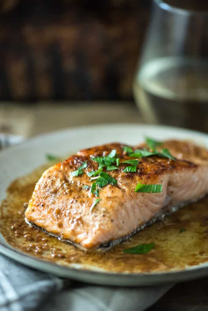 This Pan Seared Salmon with Lemon White Wine Butter Sauce is a fast and easy salmon recipe for busy weeknights. Only six ingredients and 20 minutes!