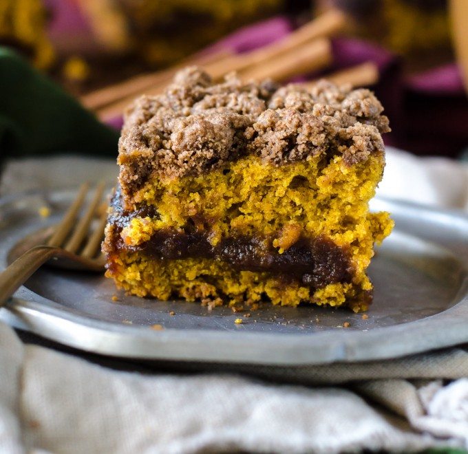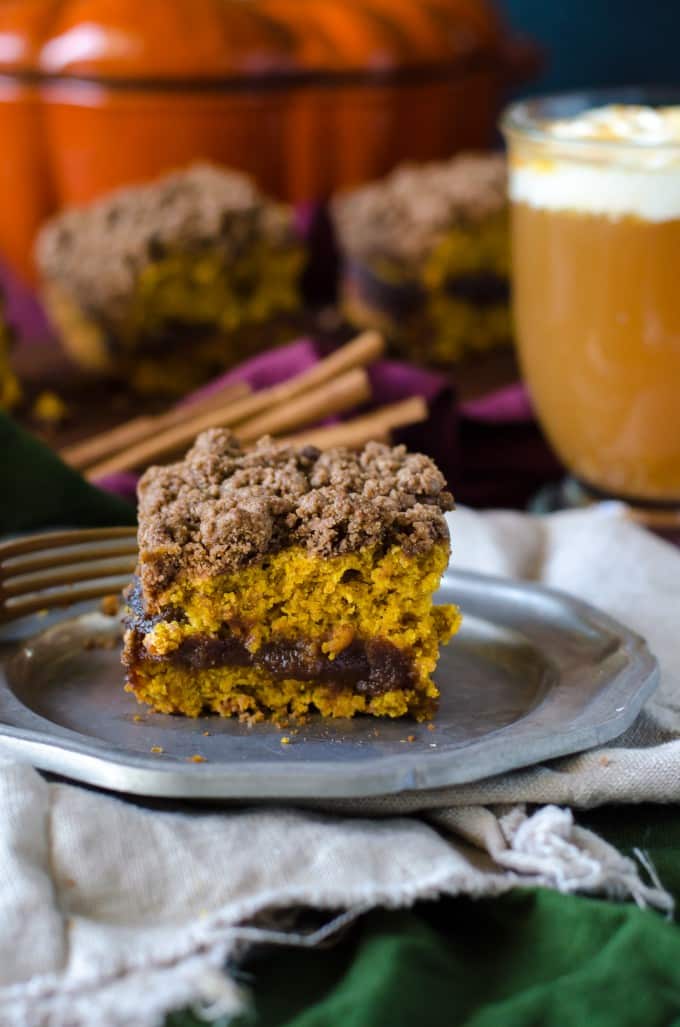 This Pumpkin Coffee Cake recipe is extra “fall”- thanks to the abundance of warm spices, crumb topping and ribbon of apple butter filling! It really is the best pumpkin coffee cake recipe!