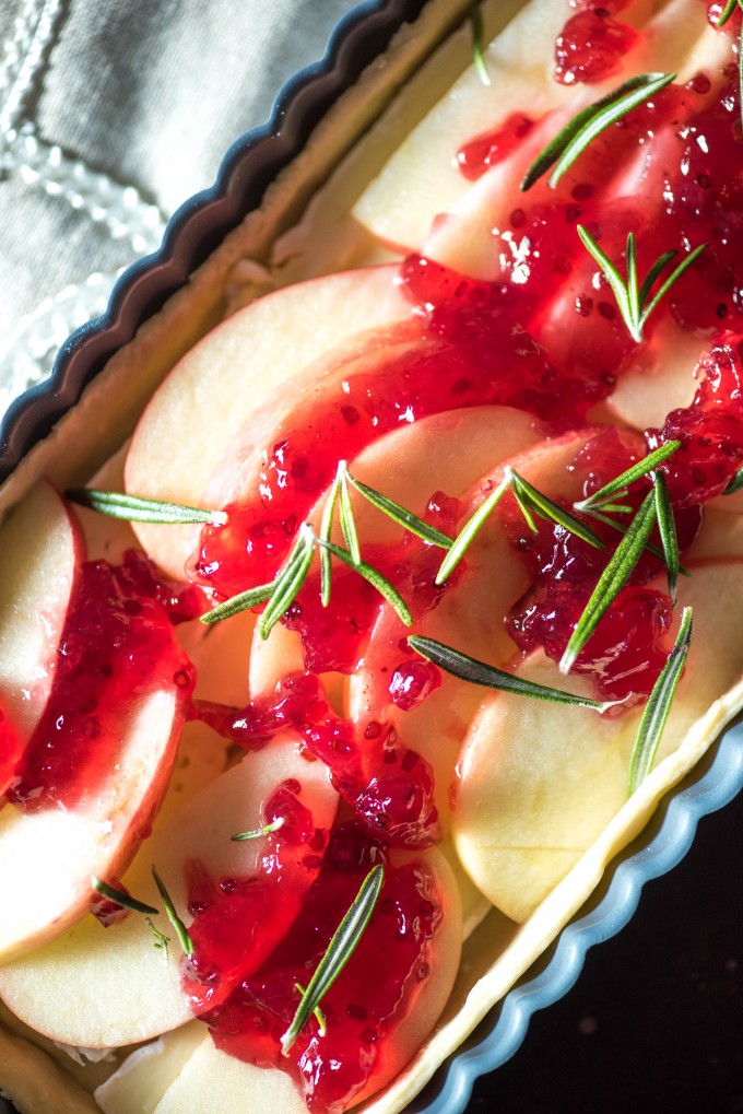 Once I tried the red currant fruit spread, I dreamed up this dish in an instant- the tartness of the red currants went so well with the sweet crispness of a fresh fall apple and the mild creaminess of brie, with savory notes from fresh rosemary and balsamic vinegar, just to give a little earthiness to the classic combination.