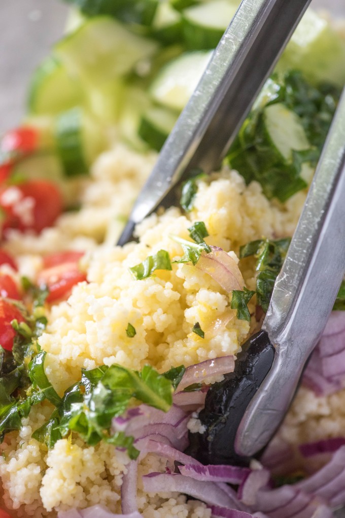 - Pour the dressing over the couscous and vegetables; toss until evenly combined.