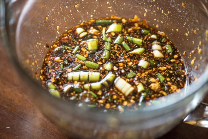 - In a large measuring cup or bowl, add vinegar, soy sauce, brown sugar, garlic, red pepper flakes, mustard and green onions. Stir to combine.