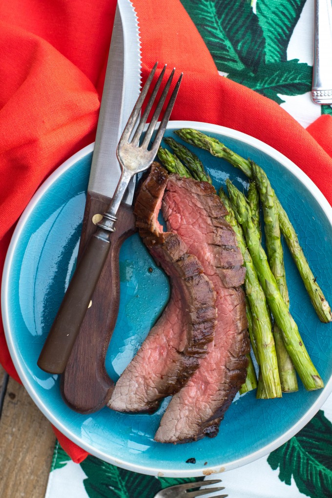 I exclusively buy the Member’s Mark brand Angus Flank Steak at Sam’s Club (and that’s a true fact, I’m not just saying that). It’s often significantly cheaper AND bigger AND better quality than what I see at the grocery stores around me. I paired it with a super simple side dish of roasted asparagus (also from Sam’s Club) – just cut, put in a grill basket, drizzle with olive oil, garlic salt, and pepper. Maybe 30 seconds of prep, and it cooked right alongside my steak.